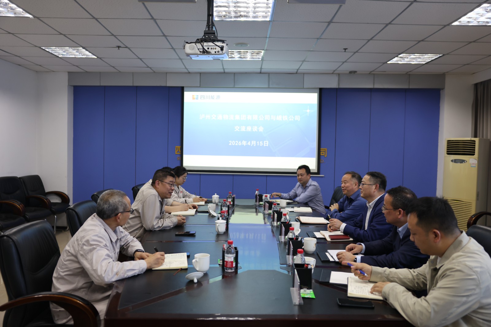 4月15日,泸州交通物流集团有限公司王洪禹董事长一行到访峨铁公司,开展商务考察与合作洽谈。峨铁公司党委书记、董事长陈新龙出席座谈会。